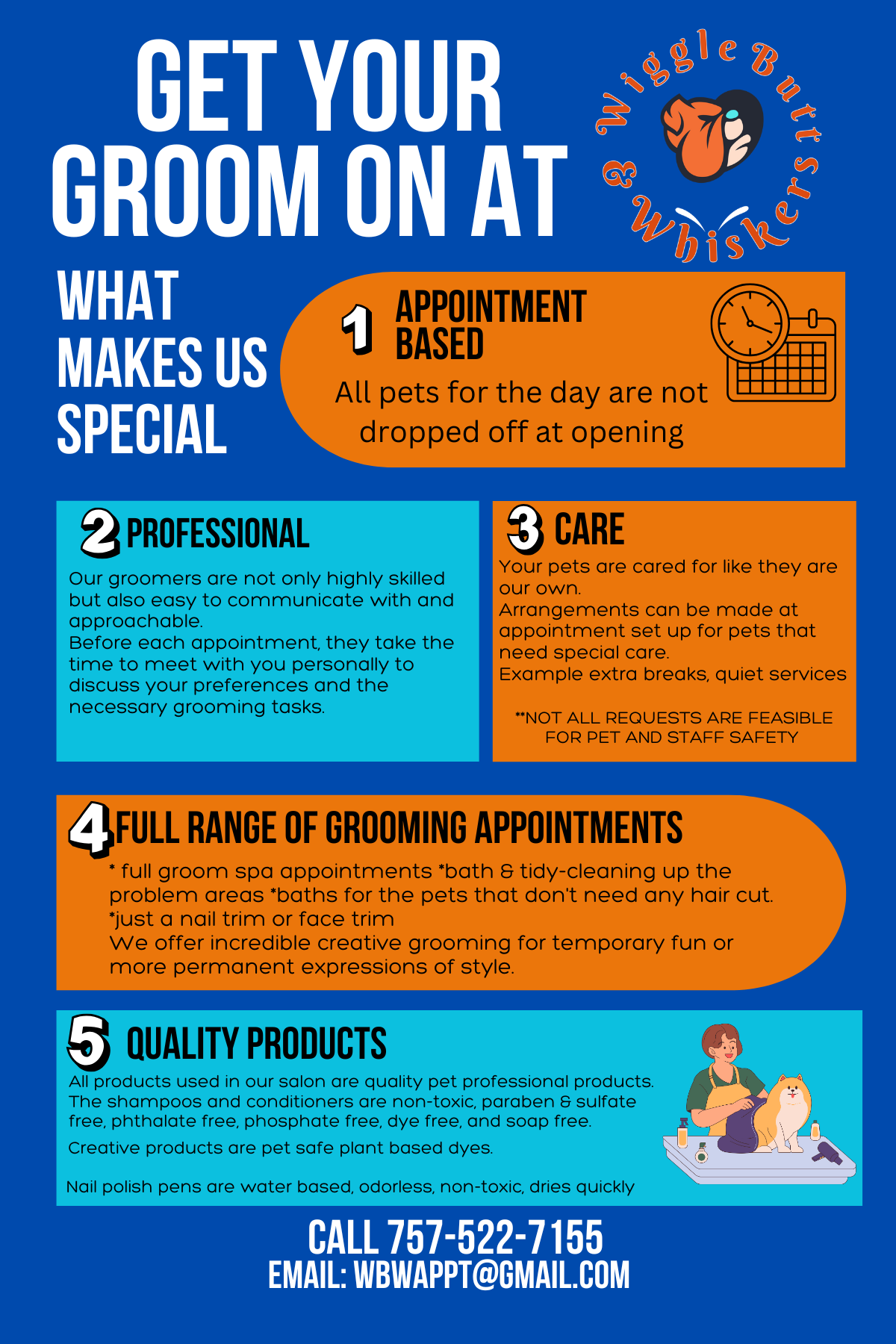 Indulge your pets with our cruelty-free and pet-safe hair dye for every special occasion. We also offer nail polish services.